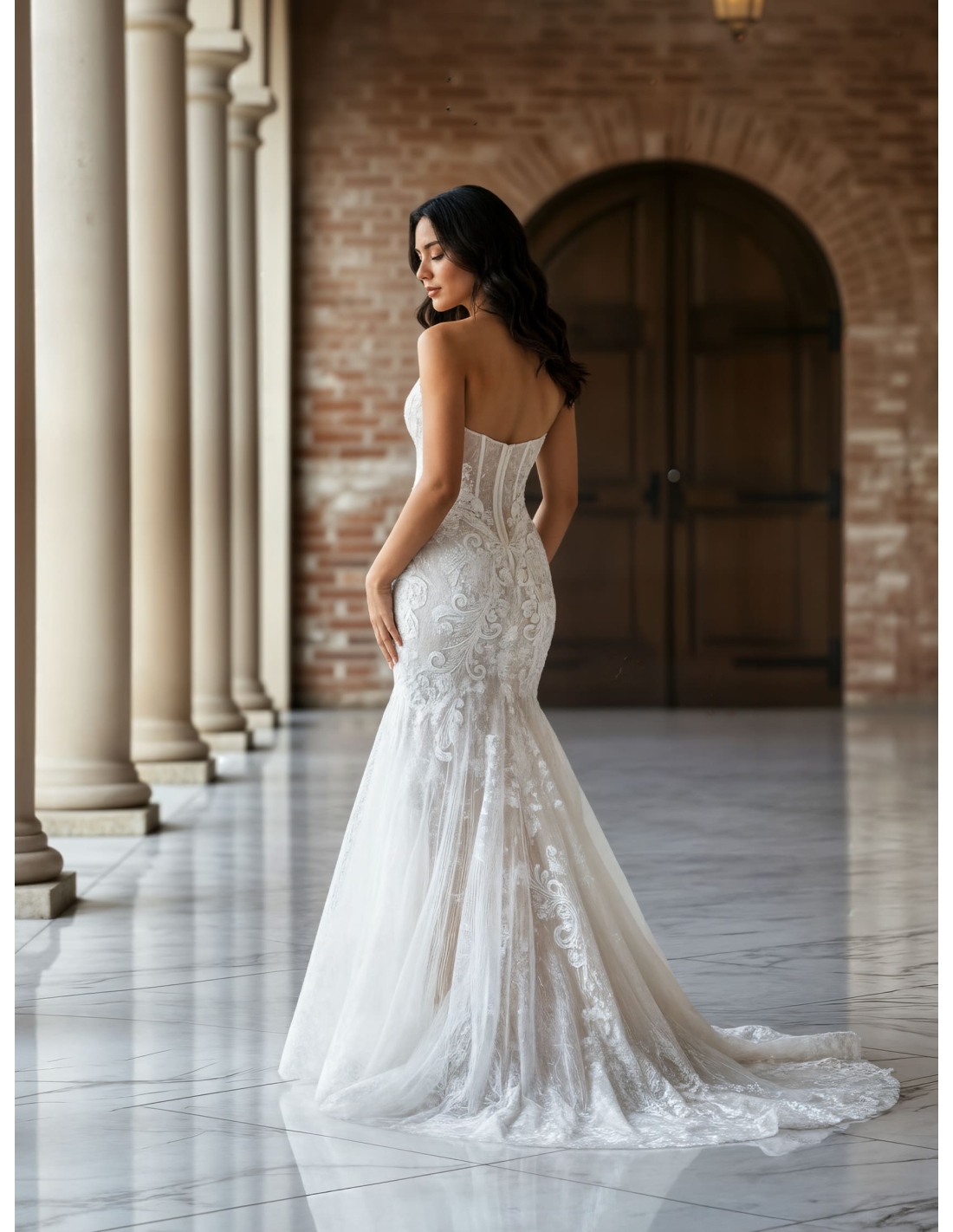 Modello: Abito da sposa che esalta la silhouette con una raffinata linea a sirena. Il corpetto strutturato, con una profonda scollatura a V e delicati ricami in pizzo, avvolge il busto con eleganza e sensualità. Il design aderente si apre dolcemente sul fondo in una coda vaporosa, arricchita da dettagli ricamati che aggiungono un tocco di regalità. Perfetto per una sposa che desidera un look sofisticato, femminile e indimenticabile.
