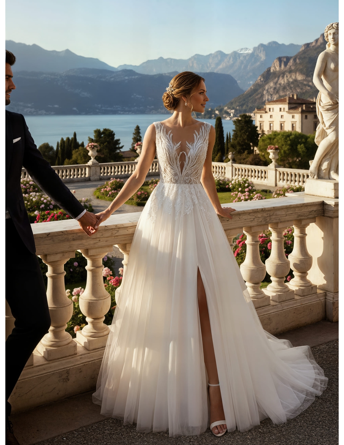 Modello: Abito da sposa dallo stile regale e contemporaneo, che racconta una storia di carattere e delicatezza. Il corpetto, finemente ricamato, si apre in un profondo scollo a punta incorniciato da maniche velate con volume leggero e struttura corta, che donano un tocco raffinato e teatrale. Il gioco di trasparenze sulla schiena si intreccia con ricami luminosi e una fila di bottoncini che segue la linea della colonna, esaltando la figura con discrezione. La gonna, in tulle vaporoso, scende leggera fino a terra, creando un movimento poetico a ogni passo. Un abito pensato per chi sogna di lasciare un’impronta indelebile nel giorno più importante.