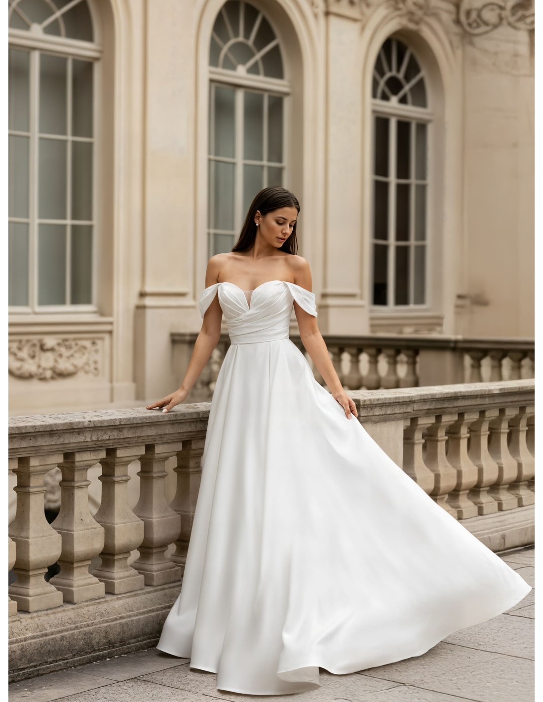 Modello: Abito da sposa che celebra la purezza delle linee e la raffinatezza dei volumi. Il corpetto, drappeggiato con maestria, valorizza il décolleté con una scollatura a cuore e delicate spalline scese che donano un tocco romantico e senza tempo. La gonna, ampia e strutturata, cade fluida in una silhouette elegante e leggera. Un modello perfetto per una sposa che ama la semplicità sofisticata e sogna un look intramontabile.