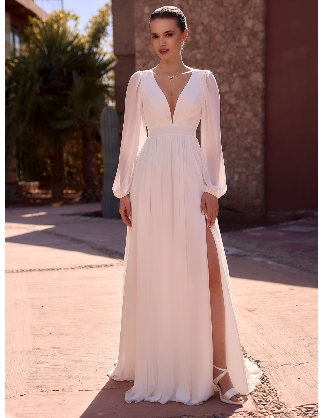 Modello: Un abito da sposa etereo e sofisticato, pensato per la sposa che desidera eleganza senza tempo. Il corpino presenta una profonda scollatura a V e maniche lunghe in chiffon leggero che donano un’allure romantica e delicata. Il punto vita è valorizzato da una fascia liscia che si fonde armoniosamente nella gonna morbida e plissettata, creando un effetto fluido e arioso ad ogni passo. Lo spacco laterale aggiunge un tocco contemporaneo e femminile, perfetto per una cerimonia raffinata ma dal carattere deciso.
