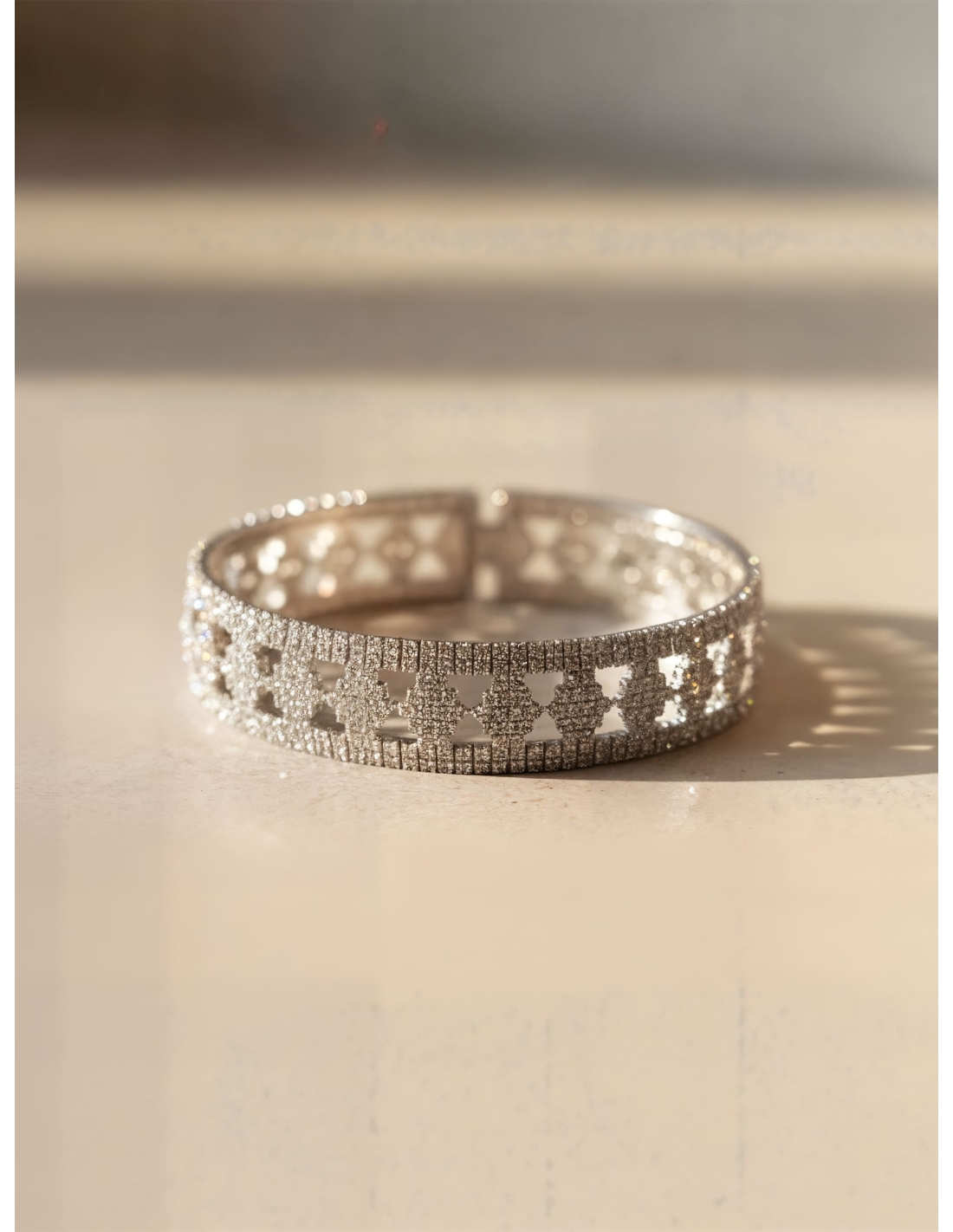 Un gioiello che cattura lo sguardo con il suo design deciso e luminoso. Il bracciale Maya è realizzato con zirconi incastonati in una struttura geometrica aperta, per un effetto sofisticato ma leggero sul polso.