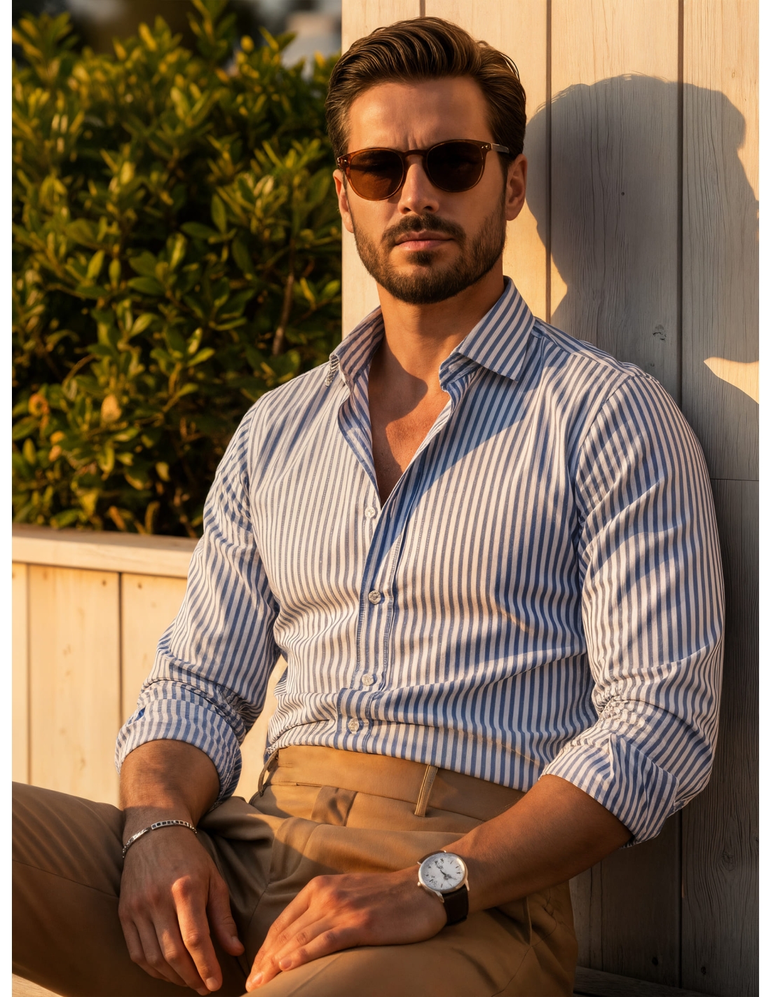 Modello: Camicia uomo a righe sottili. Il collo classico la rende ideale con cravatta o papillon, mentre la vestibilità asciutta esalta la silhouette mantenendo comfort e praticità. Un capo versatile e sartoriale, perfetto per look business, occasioni formali e outfit cerimonia dal carattere moderno.