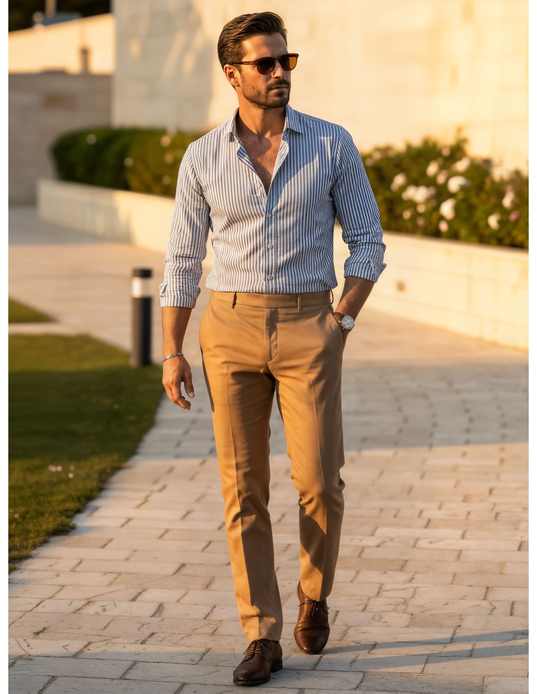 Modello: Camicia uomo a righe sottili. Il collo classico la rende ideale con cravatta o papillon, mentre la vestibilità asciutta esalta la silhouette mantenendo comfort e praticità. Un capo versatile e sartoriale, perfetto per look business, occasioni formali e outfit cerimonia dal carattere moderno.