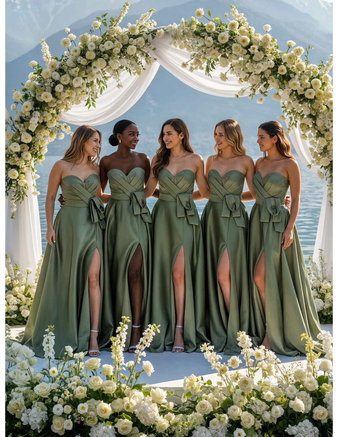 Modello: Abito dallo stile raffinato e deciso, caratterizzato da un corpetto strutturato con scollo a cuore che valorizza il décolleté con eleganza. La cintura annodata in vita sottolinea la silhouette, aggiungendo un tocco di femminilità. La gonna ampia e fluida, realizzata in un tessuto luminoso, è impreziosita da un audace spacco frontale che dona movimento e sensualità. Perfetto per chi desidera un look sofisticato e d'impatto.