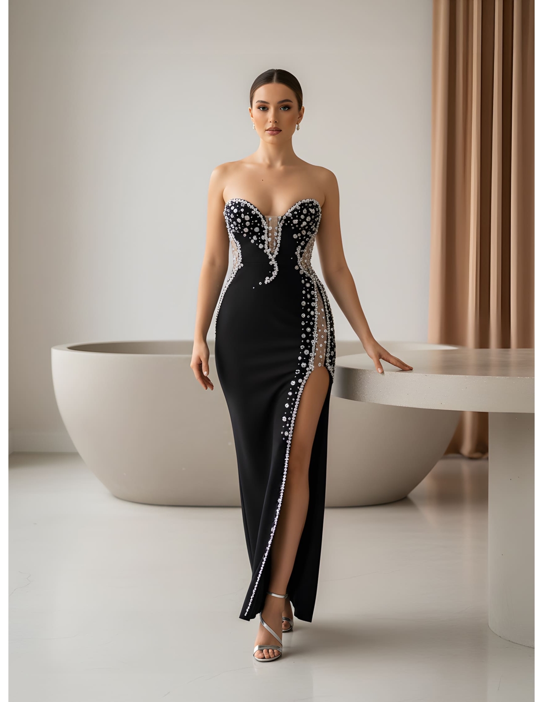 Modello: Abito bustier a sirena asimmetrico, pensato per chi desidera un’eleganza decisa e senza mezze misure. Realizzato in crepe elasticizzato con inserti in tulle nude, è interamente impreziosito da cristalli e applicazioni gioiello che disegnano la silhouette con luce e movimento. Il corpetto a cuore, strutturato e steccato, sostiene e valorizza il décolleté, mentre lo spacco alto laterale aggiunge un tocco sensuale e sofisticato. Un abito da sera che nasce per dominare la scena: perfetto per eventi esclusivi, gala e red carpet.