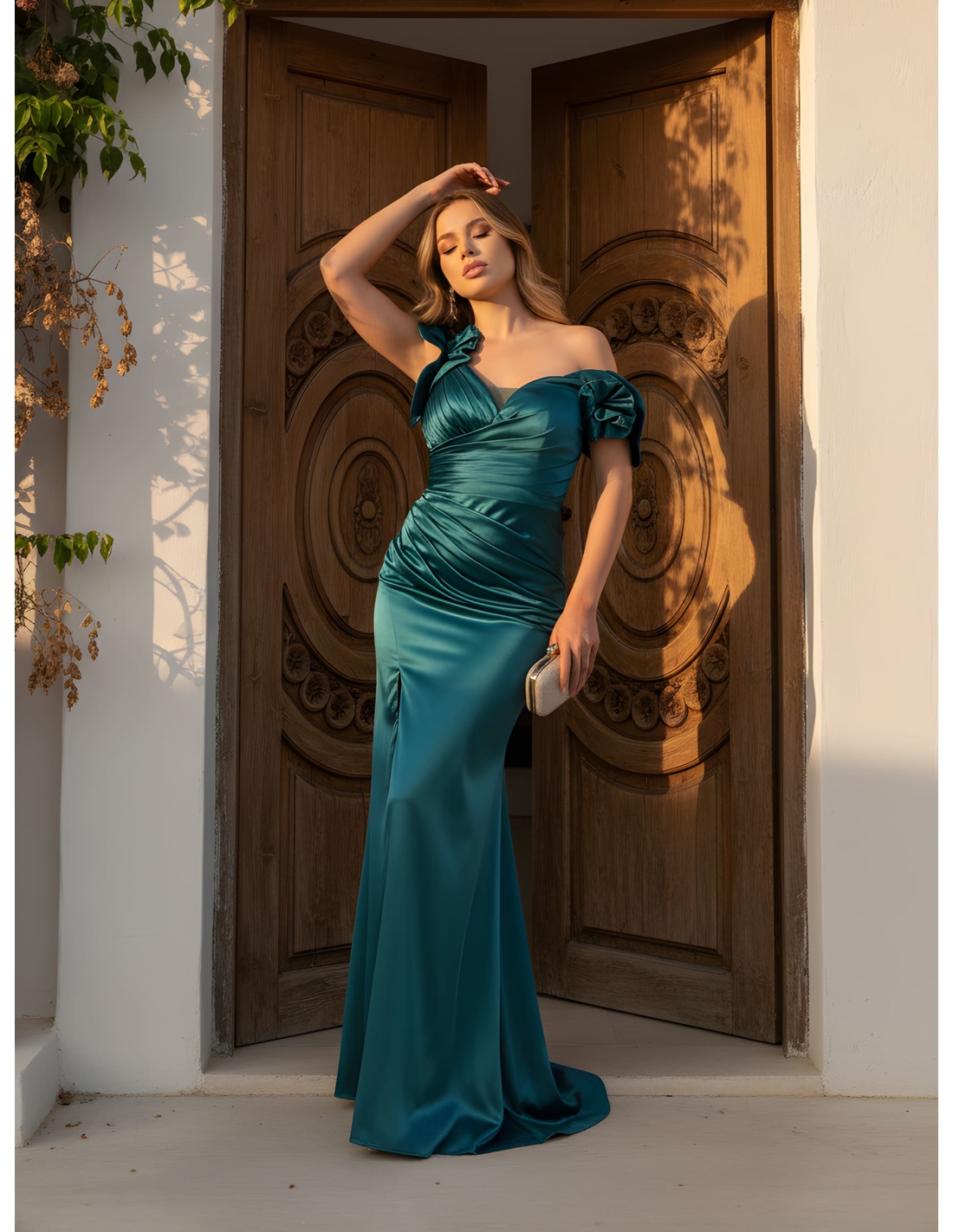 Modello: Abito da cerimonia in raso lucido con scollo a cuore e maniche asimmetriche arricciate, perfetto per chi desidera distinguersi con eleganza. Il drappeggio sul corpetto esalta il punto vita, mentre lo spacco centrale aggiunge un tocco sensuale e slancia la figura. Un modello che coniuga armoniosamente ricercatezza sartoriale e femminilità decisa.