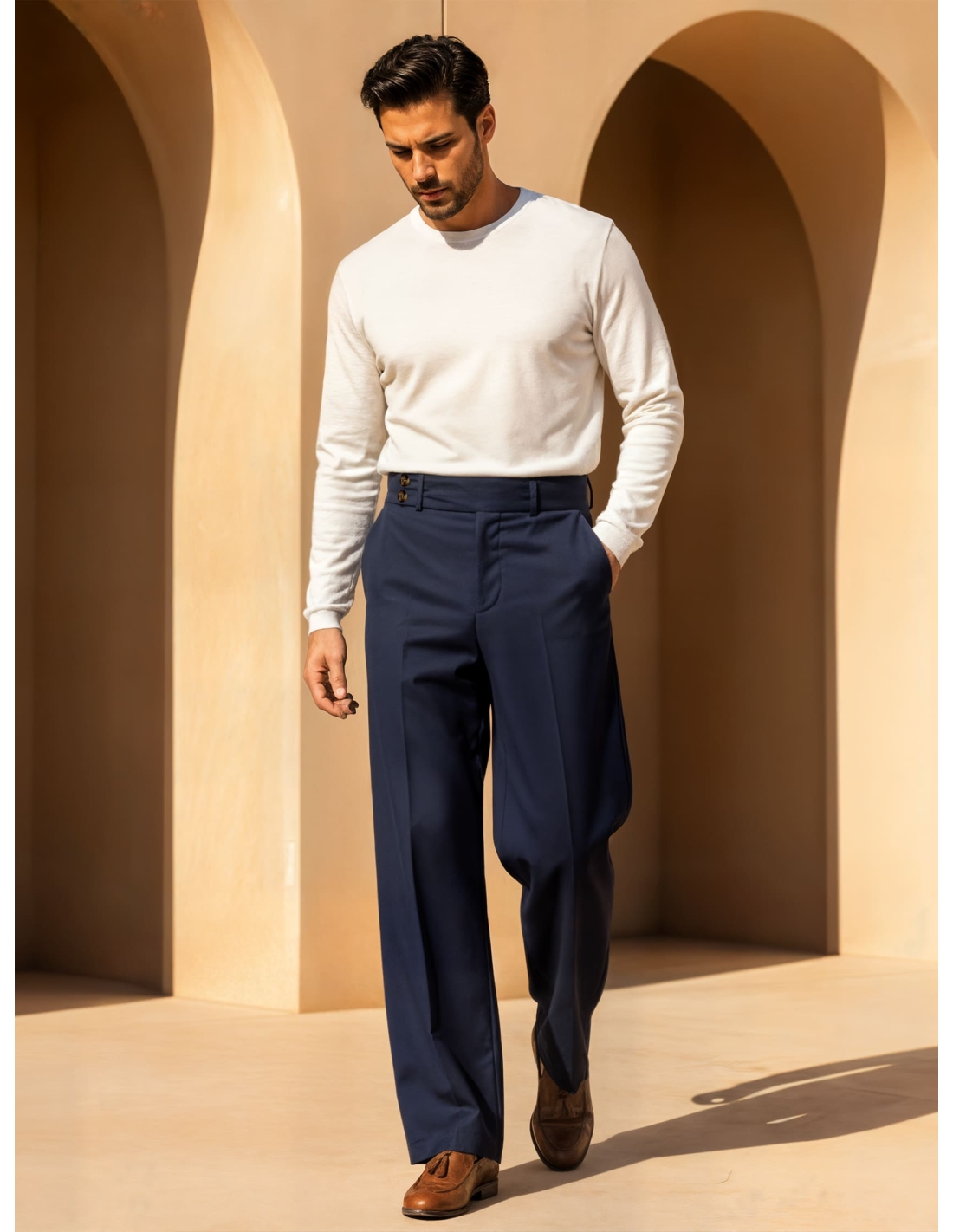 Modello: Pantalone palazzo, con taglio ampio e linea dritta che assicura comodità e portamento elegante. La vita regolare presenta passanti, chiusura frontale con zip coperta e bottone, oltre a regolatori laterali per una vestibilità precisa. Le pieghe stirate sul davanti slanciano la silhouette, rendendo il capo adatto sia ad outfit formali che a combinazioni casual di classe.