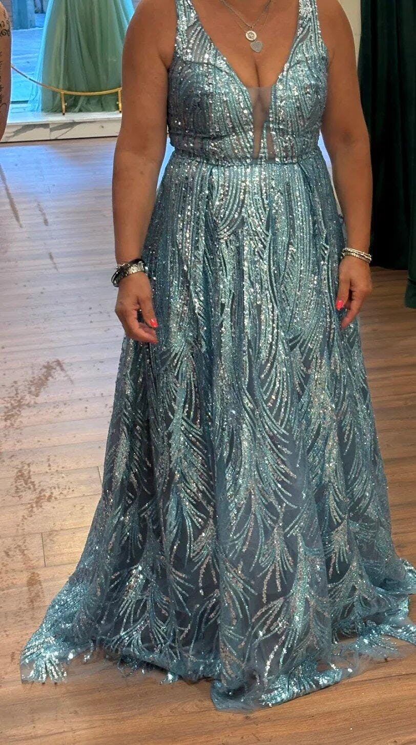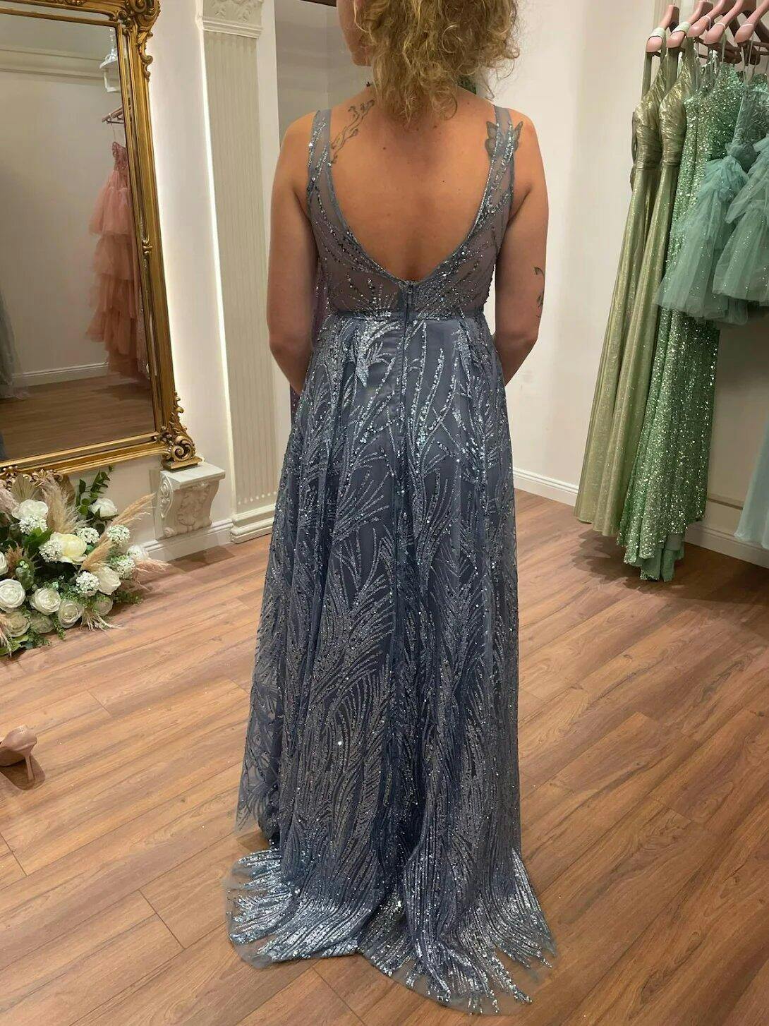 Modello: Abito lungo da cerimonia, realizzato in tulle con ricami luminosi e applicazioni di paillettes che disegnano motivi raffinati su tutta la silhouette. Lo scollo a V profondo e il corpino semitrasparente con inserti tono su tono slanciano la figura, mentre la gonna ampia e leggera conferisce movimento ad ogni passo. Un modello elegante e scenografico, ideale per matrimoni, gala ed eventi speciali dove si desidera brillare con stile.