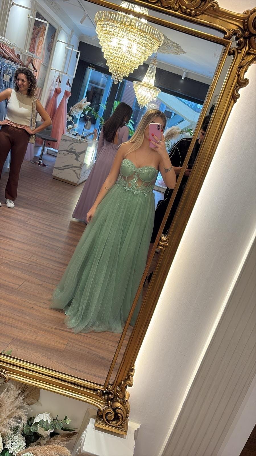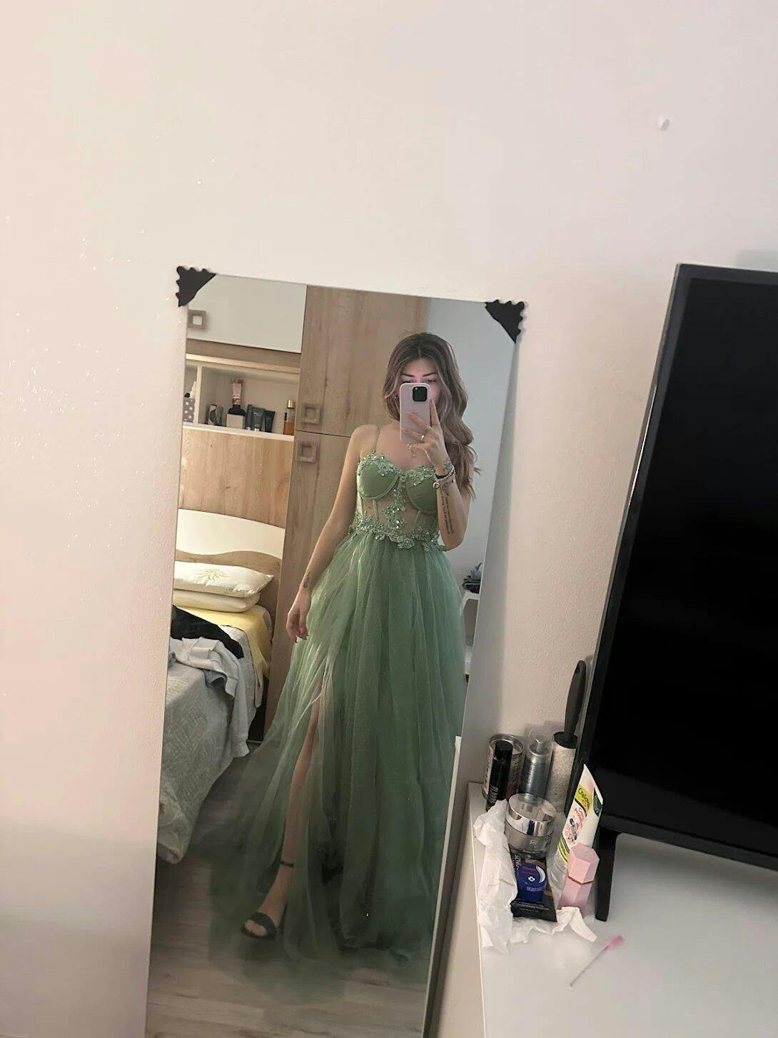 Modello: Abito lungo con corpetto a bustier e gonnellone multistrato. Il corpetto bustier, semi-trasparente, scolpisce la silhouette grazie alle stecche verticali e ai ricami floreali tridimensionali impreziositi da perline e paillettes tono su tono. Le coppe a balconcino donano sostegno e valorizzano il décolleté, mentre il retro con chiusura discreta mantiene una linea pulita e sofisticata. La gonna in tulle leggero con micro-paillettes integrate crea un effetto luminoso ad ogni movimento. Il taglio ampio e fluido, con spacco laterale, dona femminilità e slancio alla figura. Un abito perfetto per cerimonie, eventi serali e occasioni di gala.