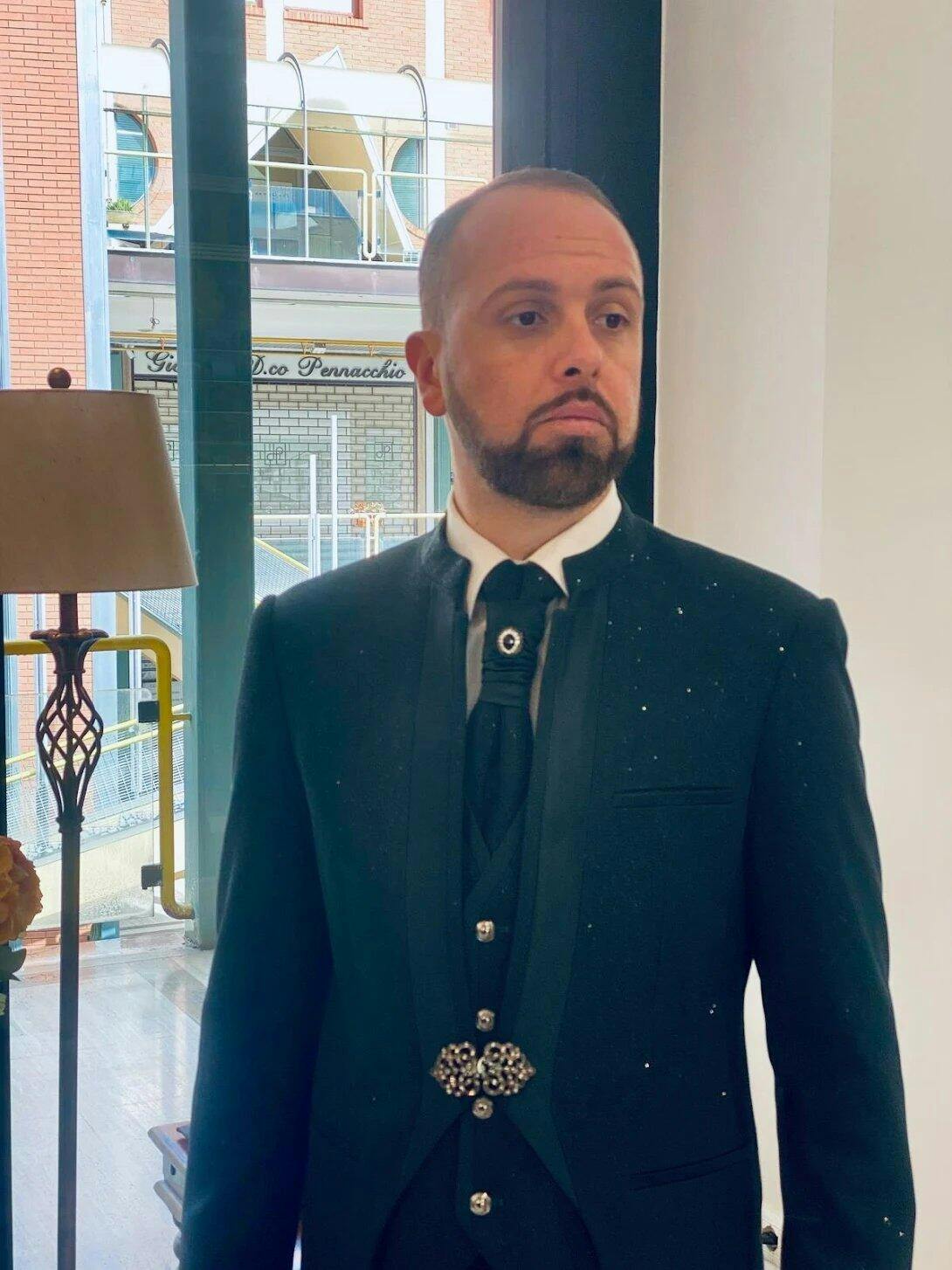 Modello: Un abito da sposo che esprime raffinatezza e stile senza tempo, perfetto per il giorno più importante. La giacca, impreziosita da un elegante collo alla coreana e un bottone gioiello, cattura l’attenzione con il suo rever decorato da una sofisticata trama in raso tono su tono. Il panciotto, coordinato alla giacca, sfoggia una trama glitterata che aggiunge un tocco di brillantezza esclusiva, rendendo il look ancora più memorabile. Il pantalone, dal taglio classico e lineare, è realizzato in un tessuto lucido che completa con sobria eleganza l’intero outfit, per un risultato di assoluta perfezione.