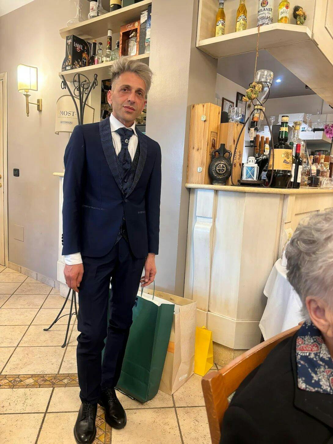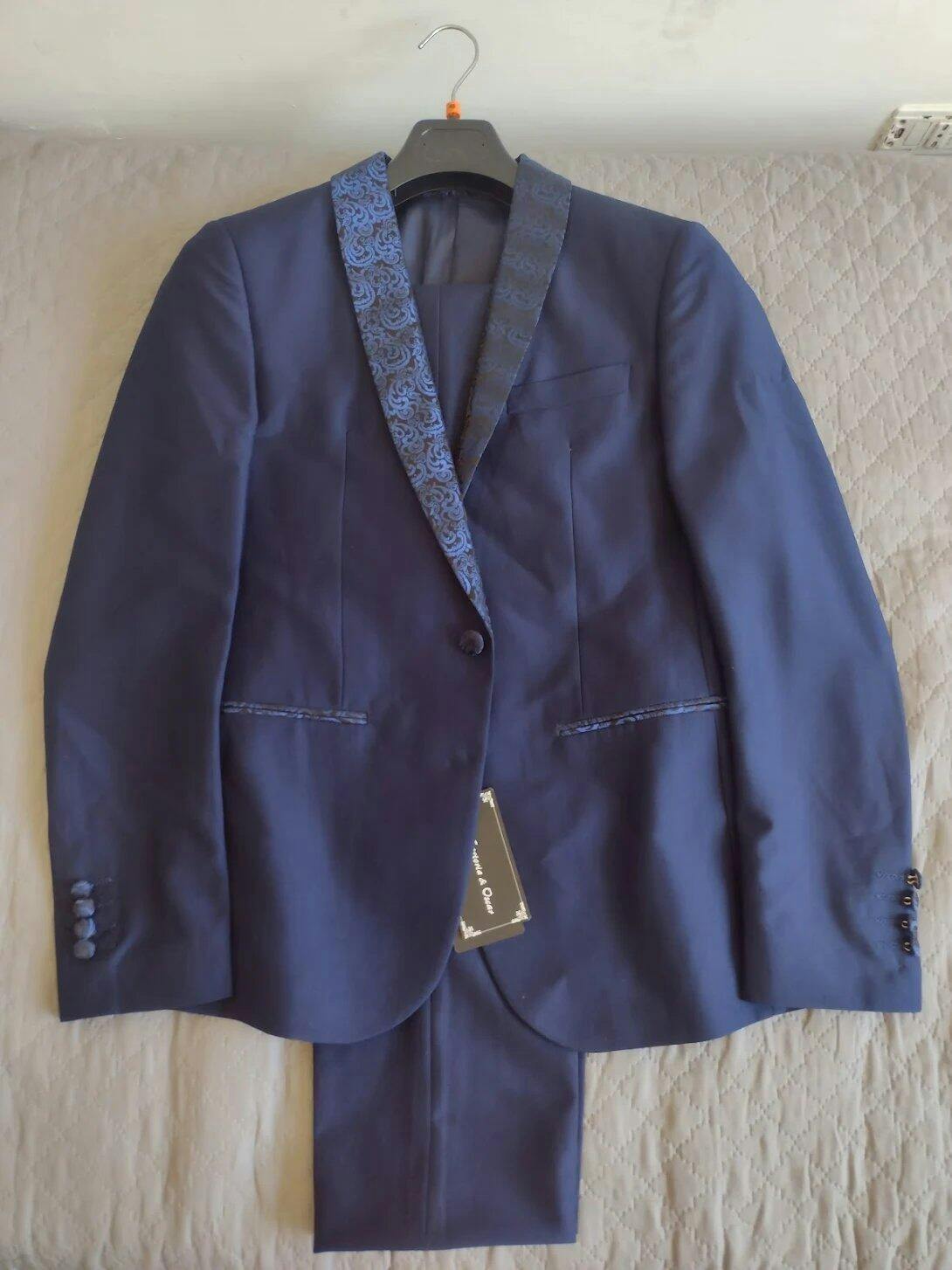 Modello: Smoking. La giacca è un petto sciallato, in tessuto damascato. Lo stesso tessuto riveste i bottoni dei polsini e dell'abbottonatura, resa da un singolo bottone. In più presenta tasca a filo sul petto e tasche a filo sul busto, il cui bordo è nello stesso tessuto del rever