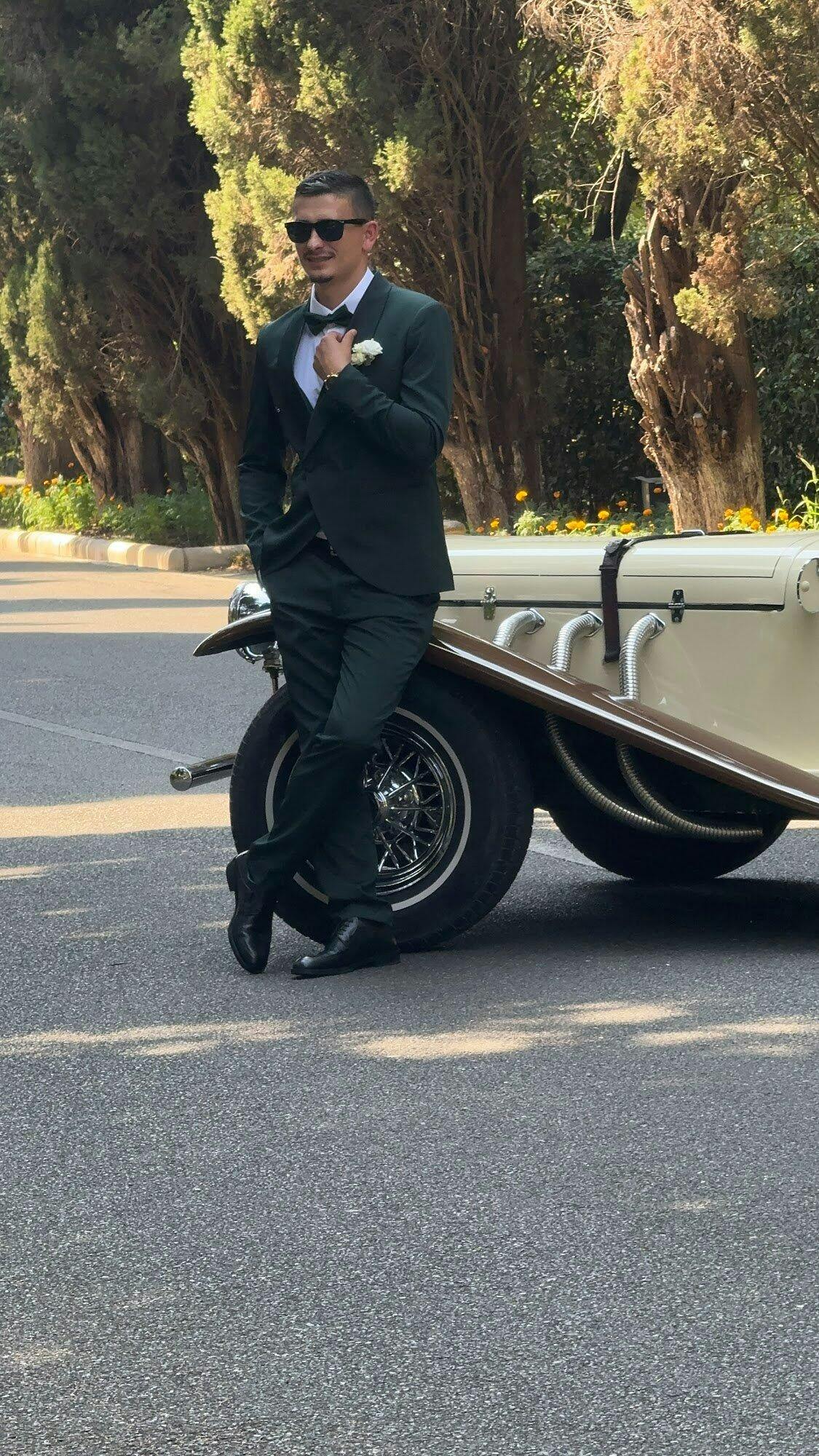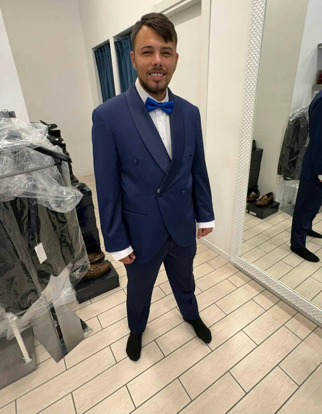 Modello: Smoking con giacca doppiopetto, collo sciallato e bottoni rivestiti. Il pantalone è un classico a gamba dritta