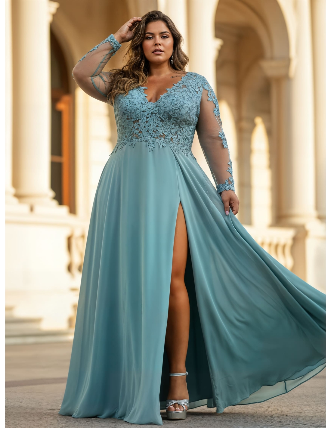 Modello: Abito lungo con corpetto in pizzo con coppe preformate e  con doppia manica. Scollatura profonda sia sul davanti che sulla schiena a V e gonna in chiffon che parte dalla vita alta e presenta uno spacco laterale su una gamba molto profondo