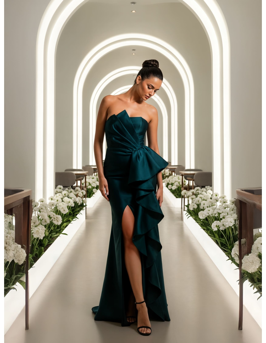 Modello: Un abito dal fascino scultoreo, “Encántame” è la perfetta sintesi tra sartorialità e impatto visivo. Il corpetto strutturato con scollo dritto valorizza il décolleté, mentre le pieghe geometriche e il maxi volant che scende lungo lo spacco frontale creano un effetto scenografico e sinuoso. Il tessuto lucente amplifica la tridimensionalità del design, restituendo luce e movimento a ogni passo. Una creazione pensata per chi desidera distinguersi con eleganza audace.