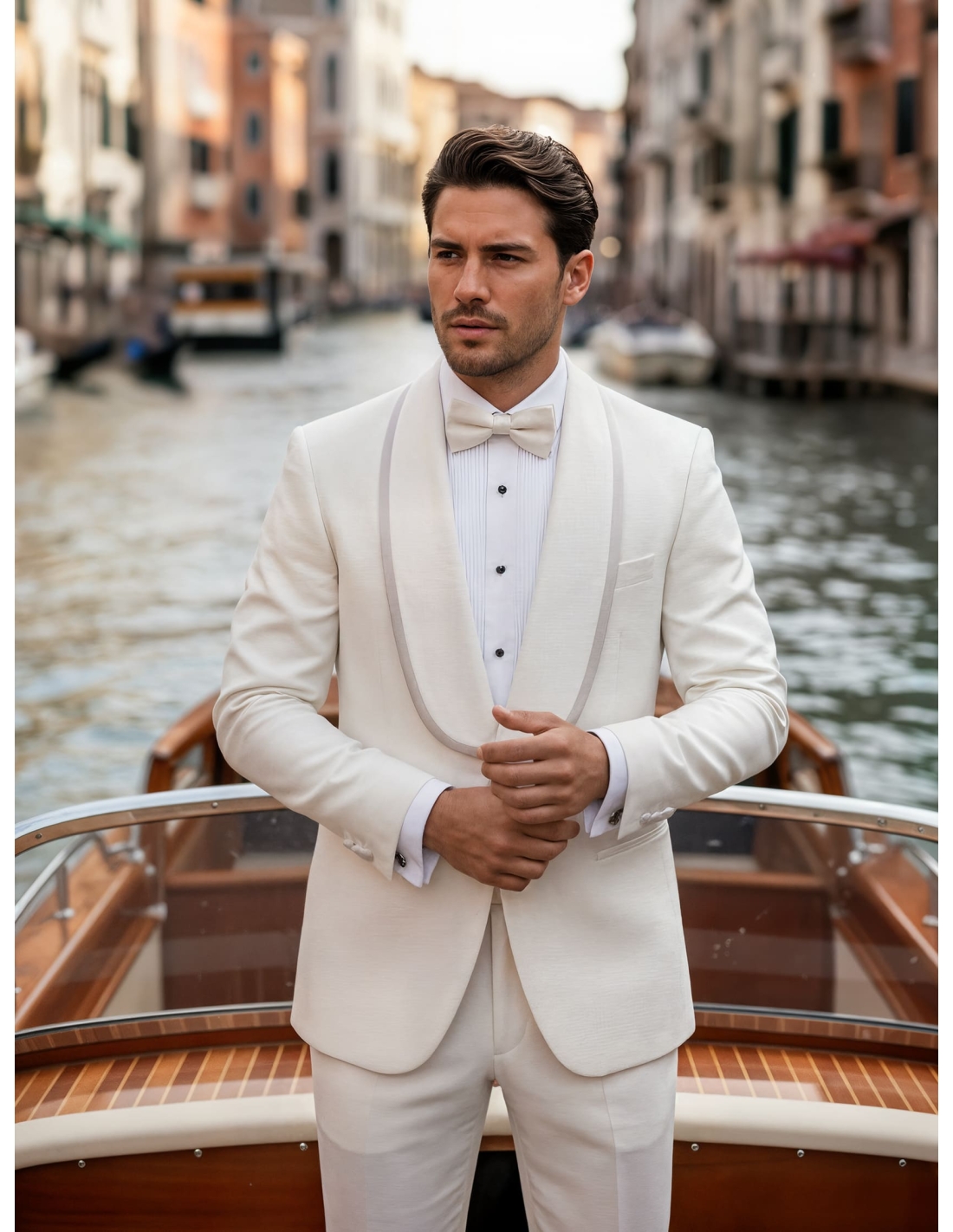 Modello: Smoking dallo stile sofisticato, impreziosito da un rever sciallato in raso tono su tono che incornicia elegantemente il petto. La giacca monopetto presenta un singolo bottone rivestito, tasche a filo e spalle strutturate. Ideale per cerimonie serali o eventi esclusivi. Il taglio aderente valorizza la figura senza rinunciare al comfort.