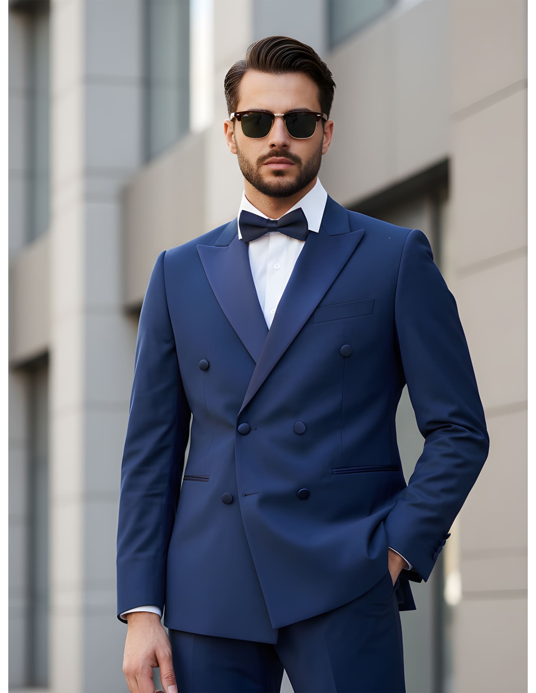 Modello: Abito con giacca doppio petto, bottoni in raso, petto a lancia in raso e due spacchi sul retro. Il pantalone si presenta con chiusura classica e al suo interno presenta 4 cm di tolleranza per poterlo allargare