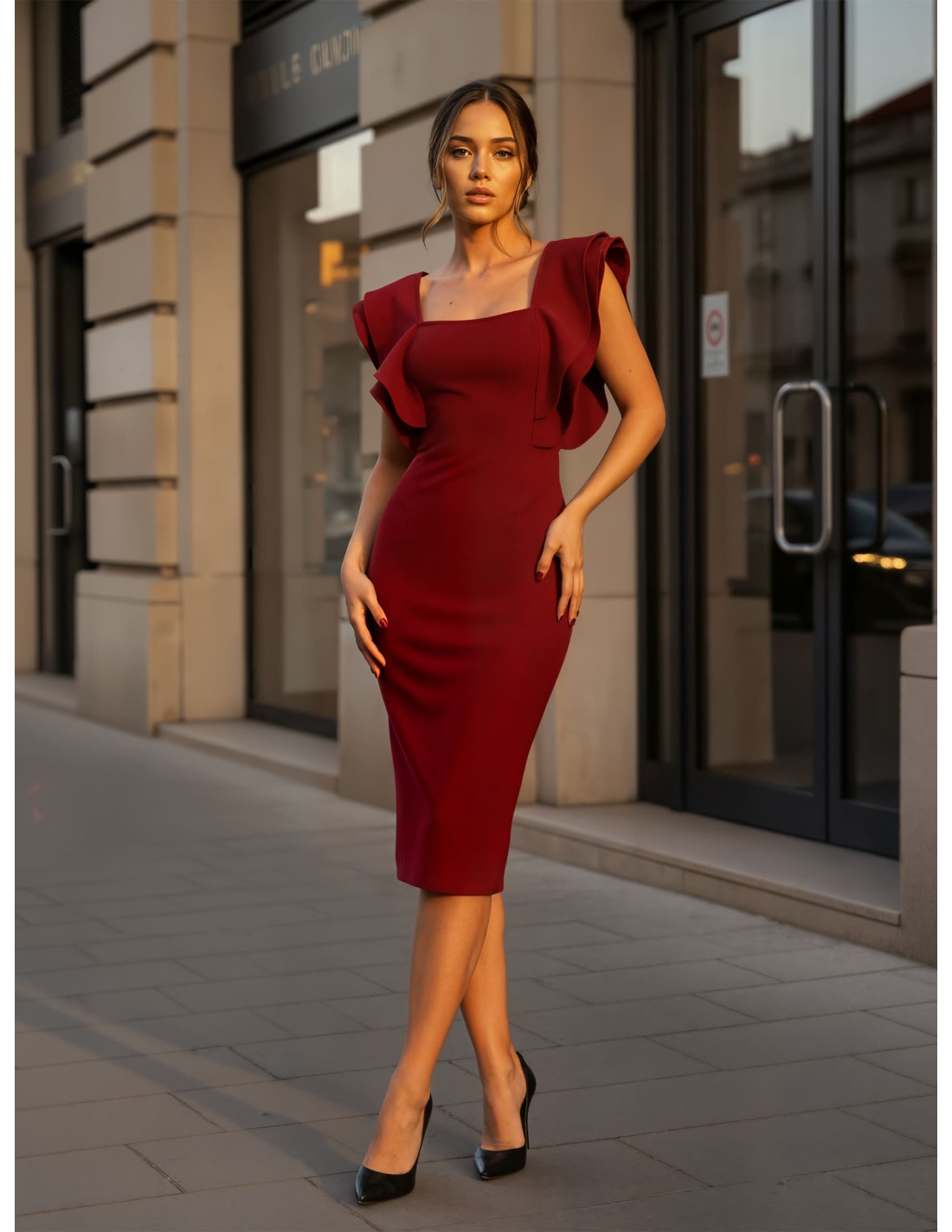 Modello: Tubino longuette. Il design si distingue per le maniche strutturate con volant, che donano volume e un tocco scenografico alle spalle, bilanciando le linee essenziali della gonna. Lo scollo quadrato valorizza il décolleté con sobrietà, mentre la chiusura con zip sul retro assicura una linea impeccabile. Perfetto per cerimonie, cocktail party ed eventi serali, questo abito trasmette eleganza senza tempo, mettendo in risalto la femminilità con un tocco deciso e contemporaneo.